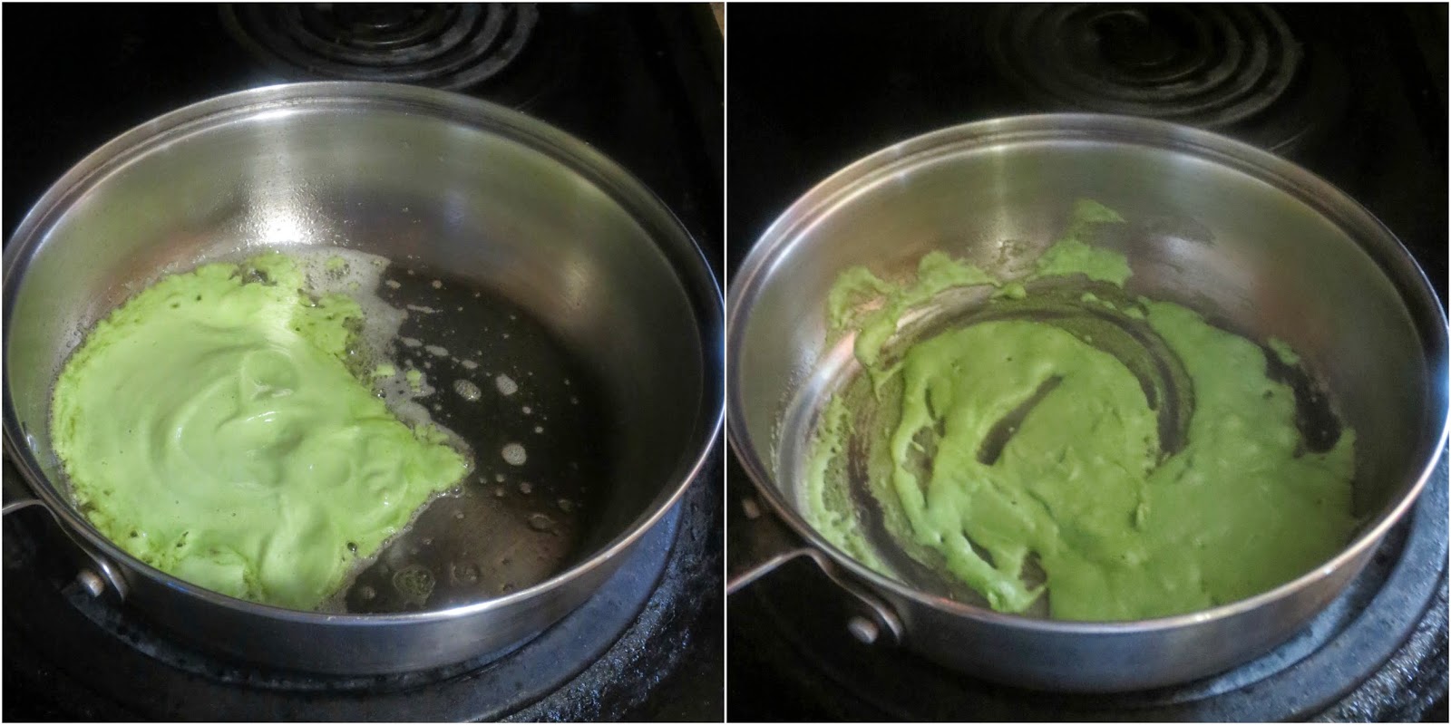 Heat a tsp of ghee and add the ground peas,saute it for a minute or two to remove the raw flavor of the green peas.